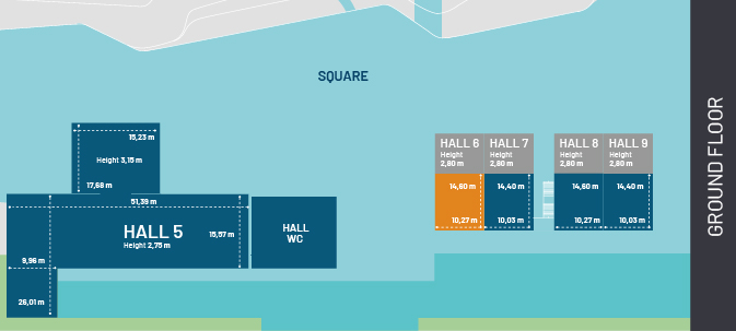 It is a room of 150 square metres, prepared to be divided into multiple spaces with a capacity to host events for 120 people in a theatre layout and 90 people if the layout is in the form of a classroom. The floor plan is 14,60m x 10,27m.