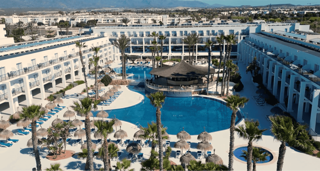 This modern 4-star hotel features spectacular aquatic facilities —two large swimming pools, a “Splash” area with water parks—, a spa with a thermal circuit, and entertainment for all audiences.