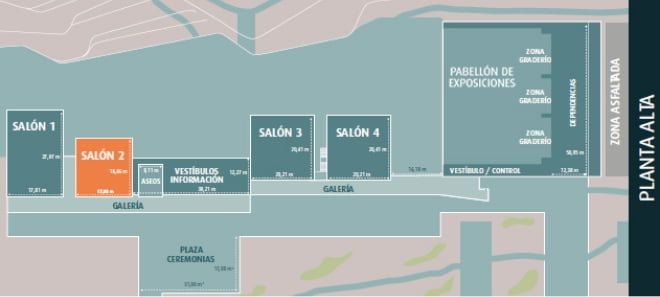 Sala de 335,10 metros cuadrados, preparada para albergar eventos de 250 pax disposición tipo teatro y 104 pax en forma de aula. La planta de esta sala tiene 18,86m x 17,82m.