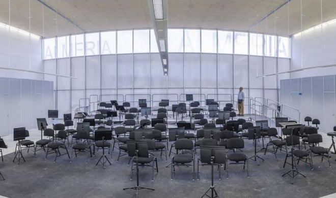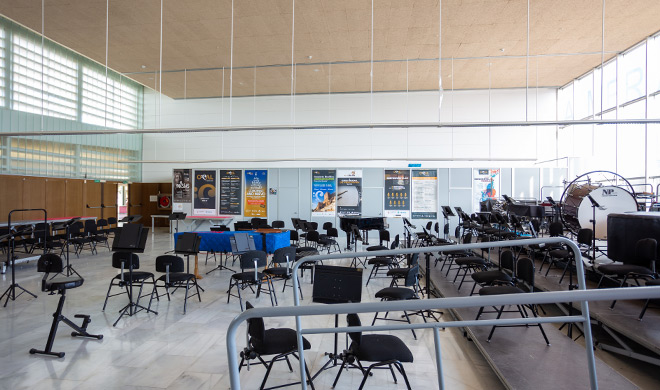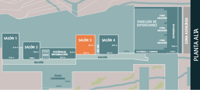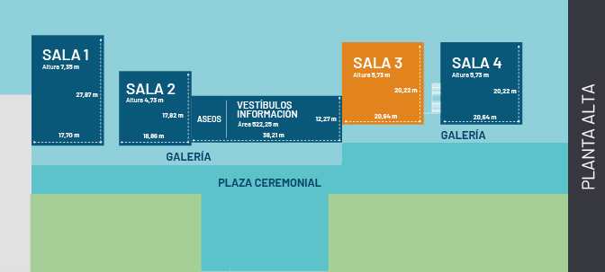 Sala con 419,50 metros cuadrados, preparado para albergar eventos de 350 pax con disposición de teatro y 300 pax si la disposición se hace en forma de aula. La planta es de 20,22m x 20,64m.