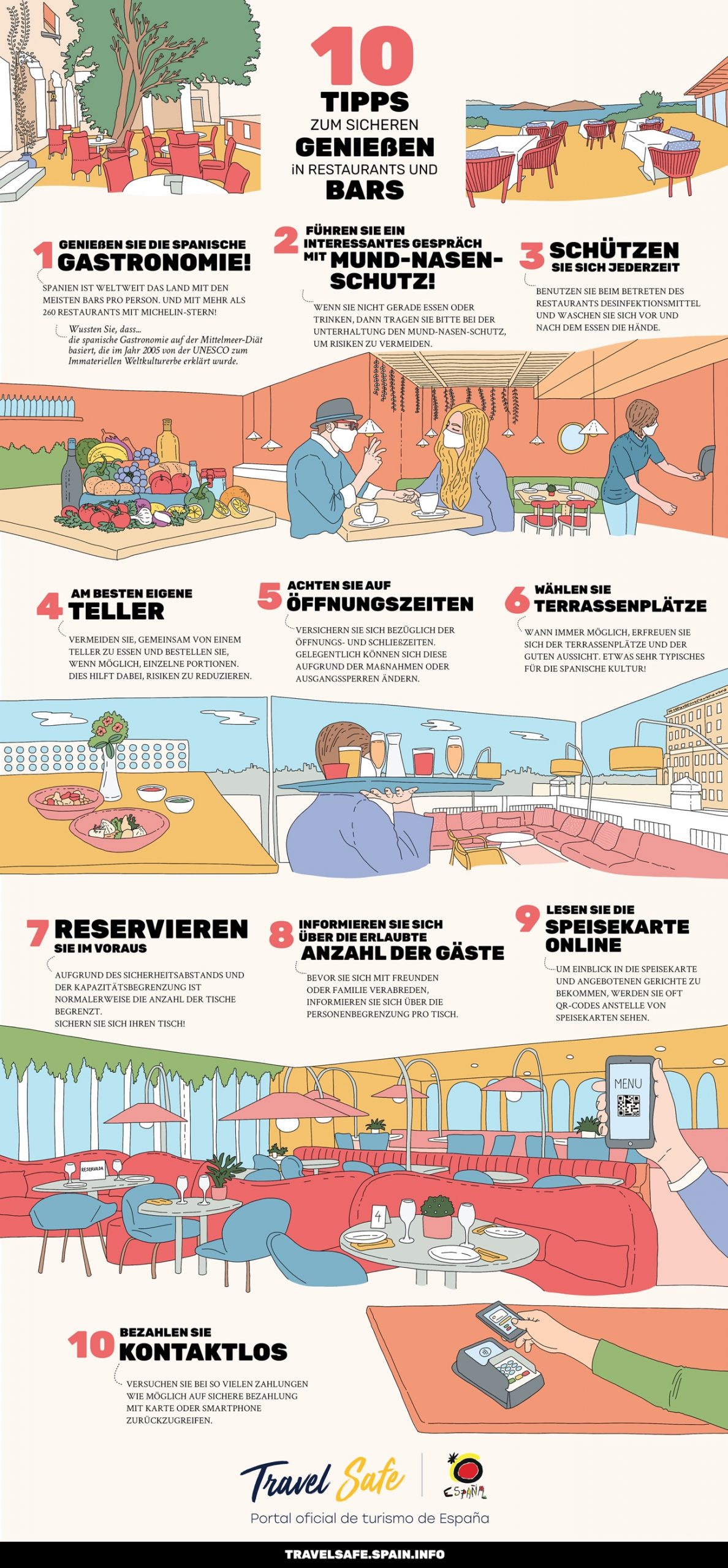 Jedes Reiseziel hat für seine Restaurants und Terrassen bestimmte Öffnungs- und Schließzeiten, Kapazitäten und Sicherheitsabstände festgelegt. Darüber hinaus haben viele Einrichtungen zusätzliche Protokolle implementiert, um die Infektionen zu reduzieren.