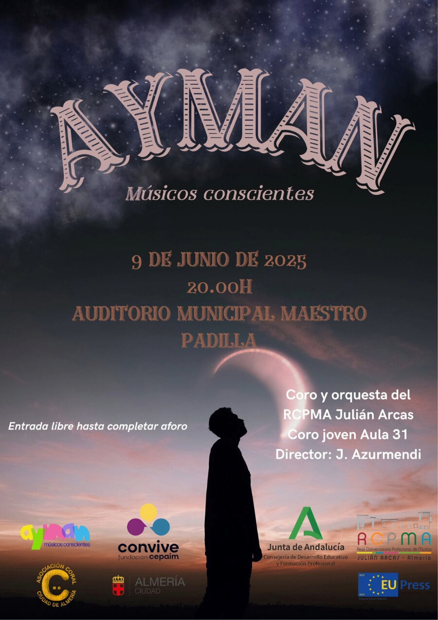 Este próximo sábado 15 de junio, en la iglesia de San Pedro a las 21:00h podemos escuchar AYMAN Músicos Conscientes esta conmovedora narración musical compuesta y dirigida por José María Azumerdi. Narrada por Jesús Herrera, está interpretada por el coro y orquesta del RCPMA Julián Arcas, el coro joven Aula 31 de la Asociación Coral Ciudad de Almería, así como participantes del Coro infantil de esta misma agrupación.