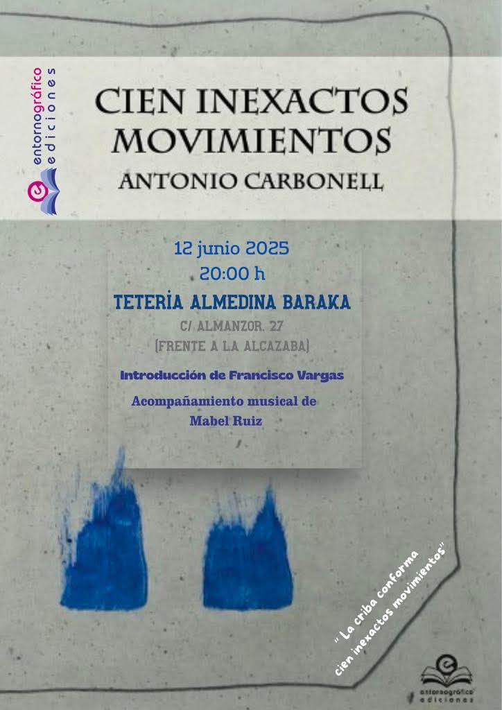 El día 12 de junio, a las 20 horas, en el bello escenario de Almedina Baraka (junto a la Alcazaba) puedes escucharla, durante la presentación del libro de poemas de Antonio Carbonell, titulado «Cien inexactos movimientos».