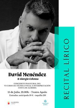 David Menéndez, uno de los barítonos más importantes de su generación acompañado al piano por Giorgio Celenza, ofrecerán en el Teatro Apolo un cuidado programa de arias antiguas de compositores como Häendel, Scarlatti, Gluck, Bach y Vivaldi entre otros. Una oportunidad única de disfrutar un repertorio que hará las delicias del público asistente de manos de unas de las voces líricas más reconocidas y aclamadas de nuestro país.