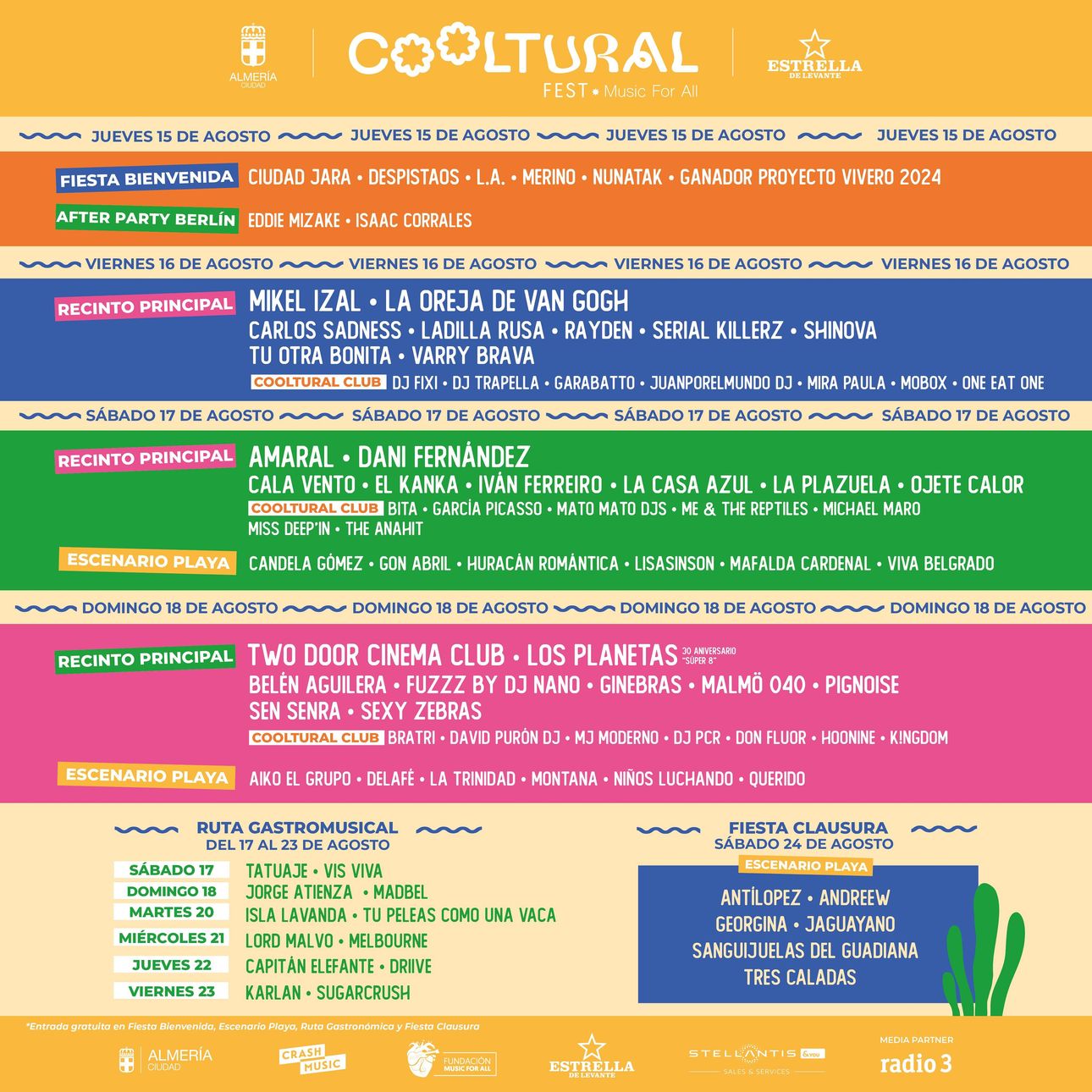 El Festival de Música más accesible de Europa. Han pisado los escenarios de este festival artistas como, Izal, Nathy Peluso, Rozalén, Rigoberta Bandini, Love of Lesbian, Amaral o La M.O.D.A.. Comprando un abono, tienes acceso a los principales conciertos en el “Recinto Cooltural” que tendrá lugar en la ciudad de Almería los días 15,16,17 y 18 agosto de 2024. Además, podrás disfrutar de conciertos gratuitos que tendrán lugar en diferentes puntos de la ciudad.
