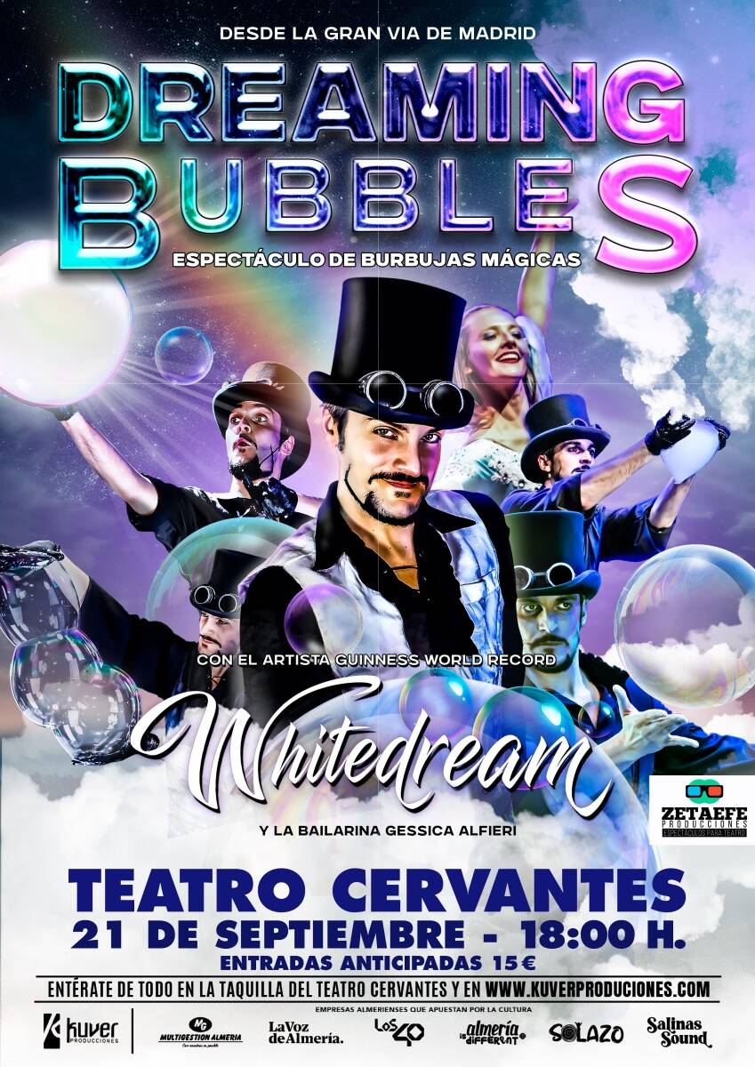Protagonizado por el renombrado artista de pompas de jabón, White Dream, galardonado con un RECORD GUINESS por su excepcional habilidad y creatividad en el arte de las burbujas. Este espectáculo es una fusión perfecta de arte, ciencia y magia, donde cada burbuja se convierte en un acto de pura belleza y delicadeza, donde las «burbujas mágicas» cobran vida, creando un espectáculo visualmente deslumbrante que encanta a espectadores ¡de todas las edades!