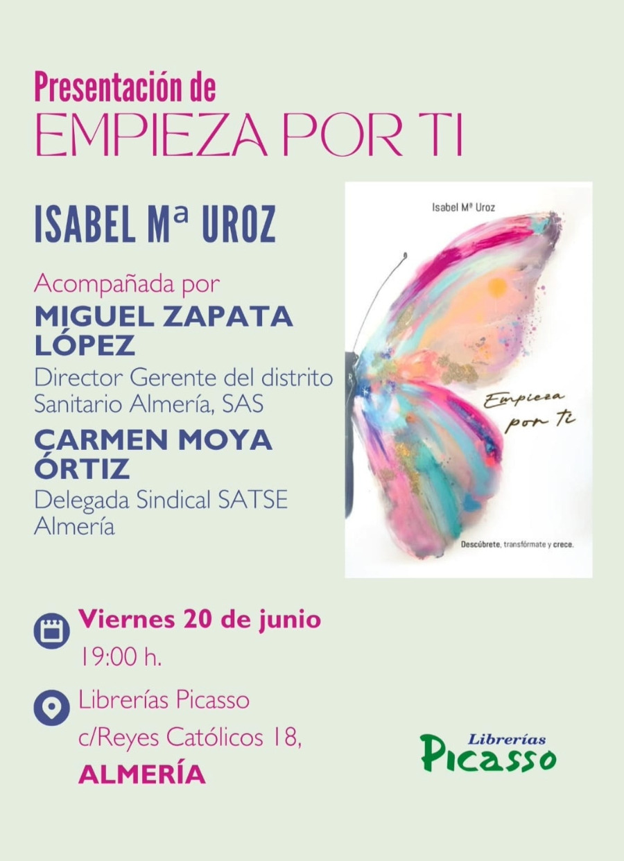 Presentación del libro «Empieza por ti» con Isabel Maria Uroz, acompañada por Miguel Zapata López, director Gerente del distrito Sanitario Almería SAS, Carmen Moya Ortiz, delegada sindical SATSE Almería.