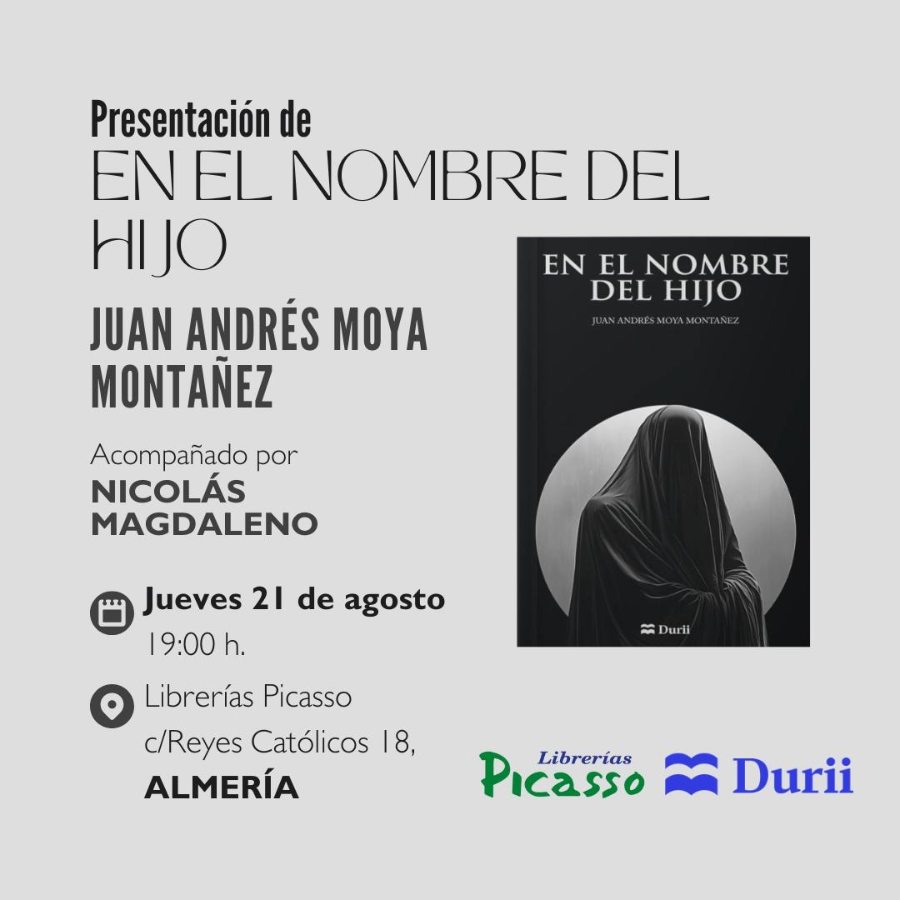 Jueves 21 de agosto a las 19:00h presentación de libro «En el nombre del hijo» de Juan Andrés Moya Montañez acompañado por Nicolás Magdaleno en Librerías Picasso en la Calle Reyes Católicos 18 de Almería.