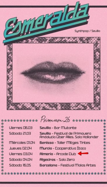 Esmeralda actuará en Arcade Club Almería el 3 de abril de 2026 como parte de su gira de primavera.