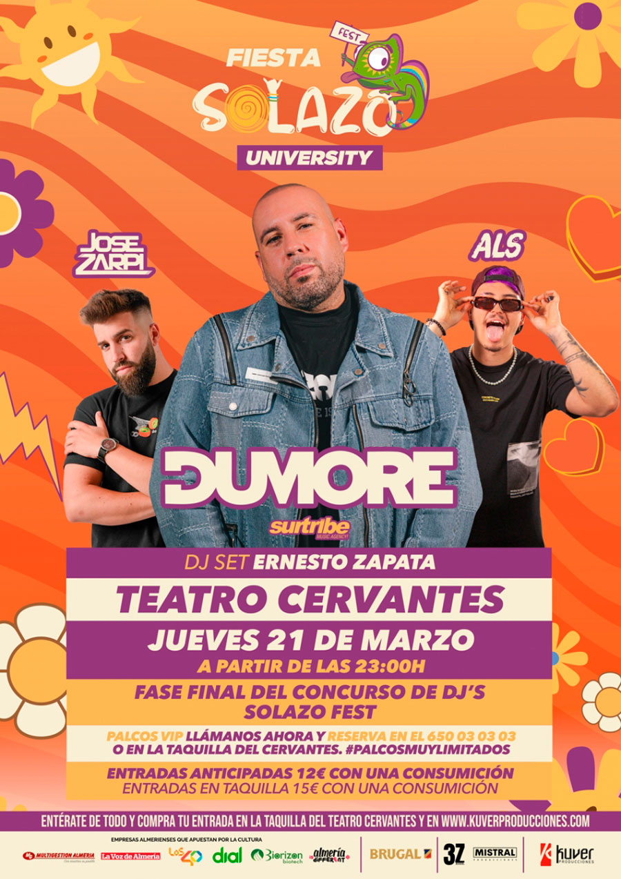 No te pierdas la ‘Fiesta Solazo University’ donde los Dj’s Dumore y José Zarpi junto al vocalista ALS pondrán ritmo y música a una noche de máximo diversión.