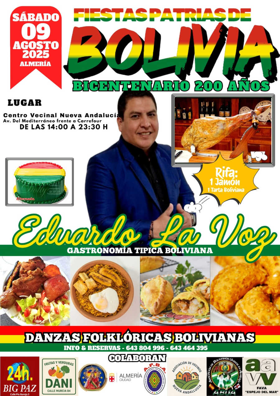Sábado 9 de agosto FIESTAS PATRIAS DE BOLIVIA en el Centro Vecinal Nueva Andalucía (Av Mediterráneo frente a Carrefour) desde las 14:00h a las 23:30h