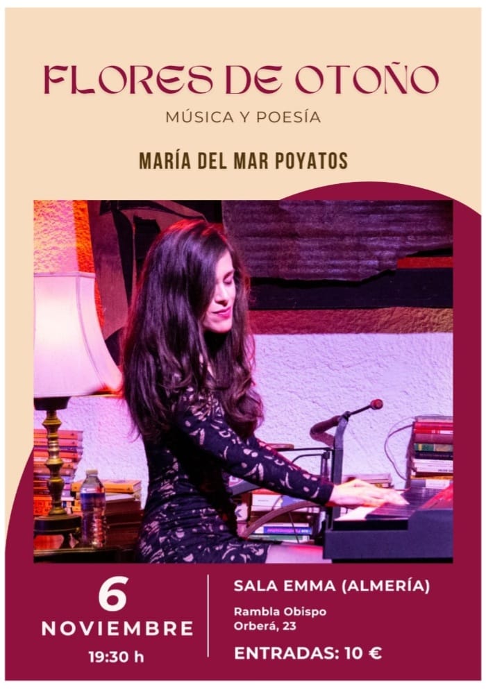 Flores de otoño es un concierto que une la música y poesía en un dialogo vivo y emotivo. La pianista y compositora María del Mar Poyatos Andújar crea un universo sonoro para dar voz a poemas de grandes autores de la lengua española como Federico García Lorca, José Ángel Valente, Mariluz Escribano o Jesús Aguado, incluyendo autores almerienses como Diego Reche y Nuria Ortega, junto a otros clásicos universales como Rainer María Rilke y Paul Verlaine. Descubre un viaje a través de la fuerza simbólica del otoño que une la palabra y la música, la tradición y la actualidad a través de la fuerza simbólica del otoño, invitando al público a descubrir nuevas resonancias en textos desconocidos y a dejarse sorprender por la fuerza de las voces contemporáneas a través de su fusión con la música para piano.