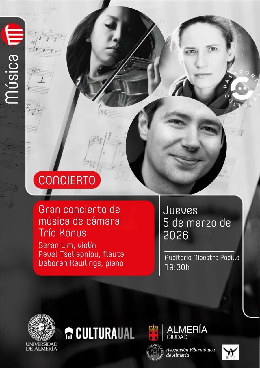 Disfruta de una magnífica velada musical con el Trío Konus en un gran concierto de música de cámara. El evento contará con la destacada participación de Seran Lim al violín, Pavel Tseliapniou en la flauta y Deborah Rawlings al piano. Esta especial combinación de instrumentos promete una experiencia sonora única y sofisticada. Organizado por la Universidad de Almería y la Asociación Filarmónica de Almería, este evento forma parte del Pasaporte Cultural. ¡Una cita ineludible para los amantes de la música clásica!