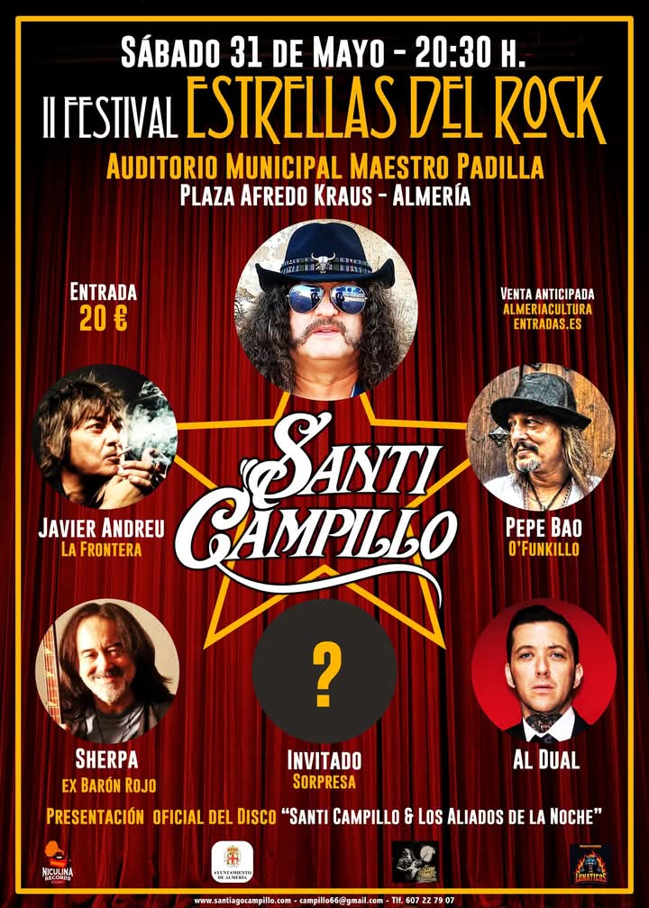 Una genuina noche de rock and roll de acto octanaje. El Auditorio Municipal Maestro Padilla recibirá el II Festival ‘Estrellas del Rock’ el próximo sábado, 31 de mayo. Una iniciativa liderada por el magistral guitarrista de rock y blues, Santi Campillo, que celebró su primera edición en Murcia el pasado 2024 y que esta primavera desembarca en Almería con una constelación de invitados de contrastada y dilatada trayectoria musical.