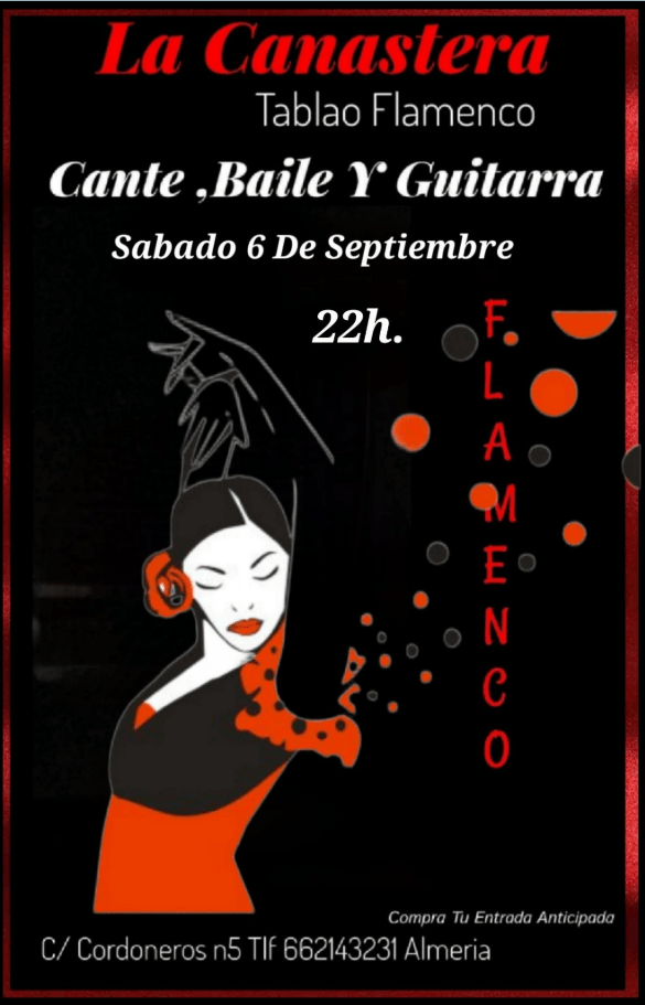 Sábado 6 de septiembre a las 22:0h en el Tablao flamenco La Canastera Tablao Flamenco La Canastera Almería se encuentra en el corazón del antiguo barrio de “La Chanca Pescadería”, entre