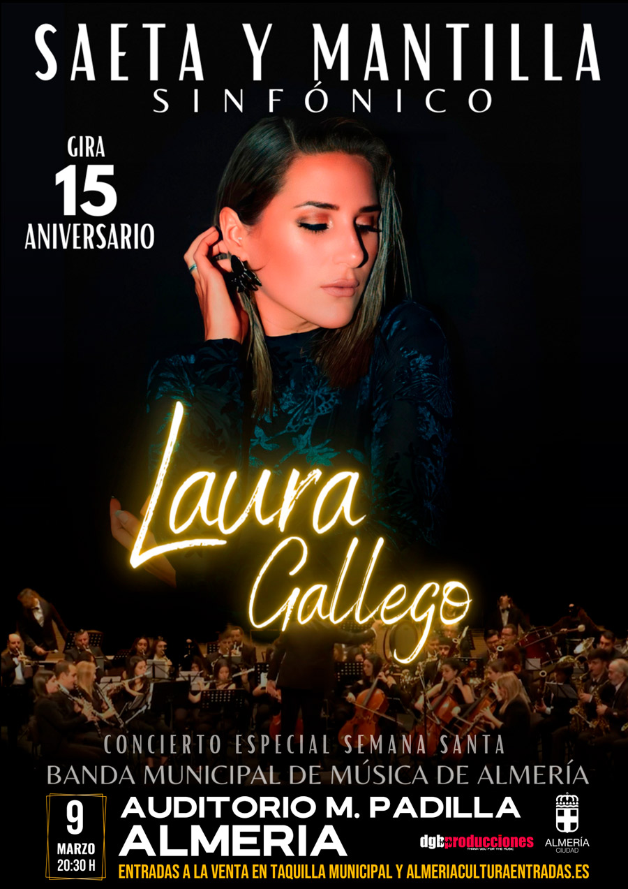 Laura Gallego, nacida en Jerez de la Frontera es una de las voces indiscutibles del panorama musical desde que fuese la principal protagonista del prestigioso programa de Canal Sur, Se llama Copla. Estrenado en la Catedral de Jerez de la Frontera, ‘Saeta y Mantilla’ cuenta con un montaje elegante y actual. Con una formación musical a la altura, como lo es la Banda Municipal de Almería, y con un recorrido por las grandes marchas procesionales de nuestra tierra, entrelazados con grandes temas versionados de manera inconfundible por Laura Gallego, contando con elementos multimedia que permitirán al público sumergirse en una atmósfera solemne y llena de misterio, tan característica de nuestra Semana Santa.