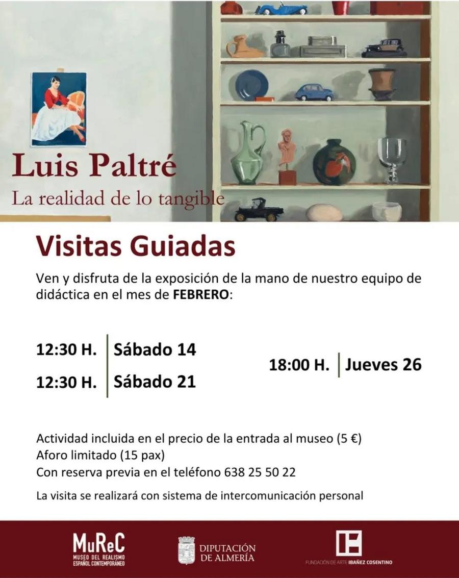 Ven y disfruta de la exposición de Luis Paltré ‘La realidad de lo tangible’. Se realizarán visitas guiadas los sábados 14 y 21 a las 12:30 horas y el jueves 26 a las 18:00 horas. Actividad incluida en el precio de la entrada al museo (5 €). Aforo limitado (15 personas), con reserva previa al teléfono 638 25 50 22. La visita se realizará con sistema de intercomunicación personal.