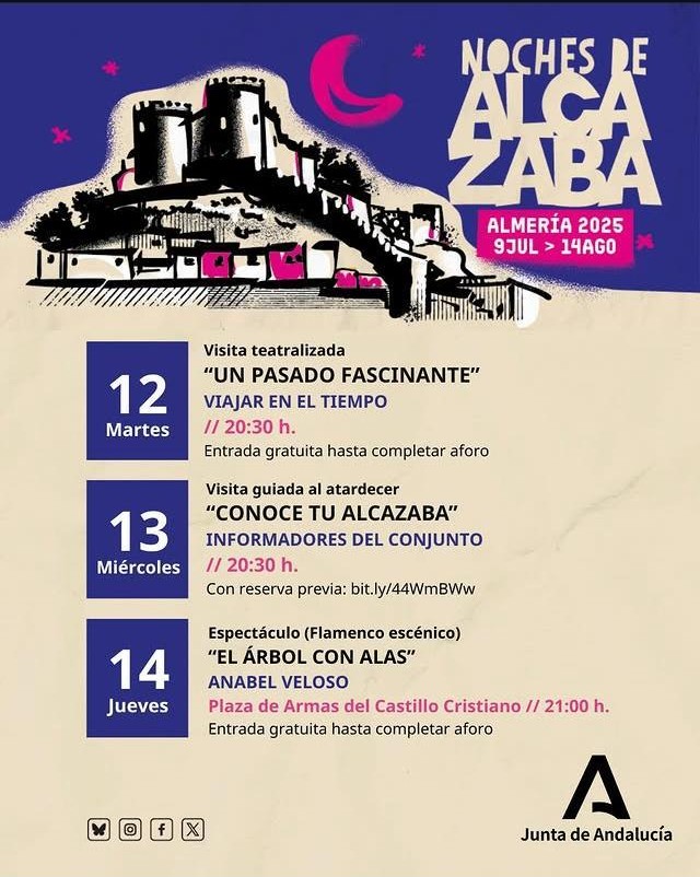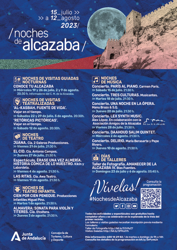 Como cada año, el Conjunto Monumental de la Alcazaba de Almería ofrece una intensa programación de verano en sus noches «Noches de Alcazaba», que este año tendrá lugar desde el 9 de julio hasta el 14 de agosto. Podremos encontrar talleres, teatro, visitas guiadas y visitas teatralizadas en un marco incomparable como es la Alcazaba de Almería, una de las fortalezas islámicas más impresionantes de España.