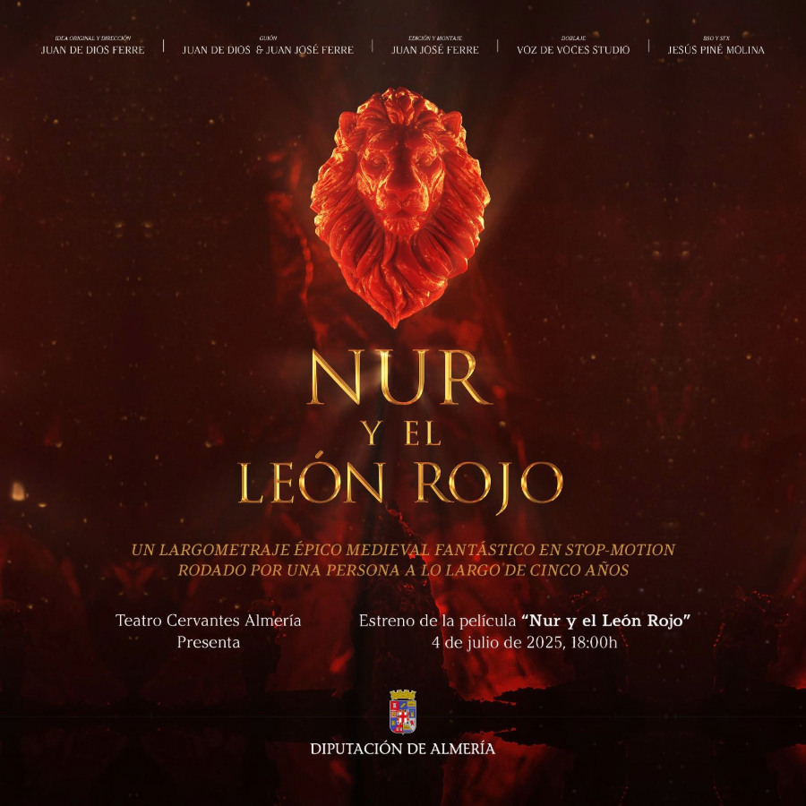 El viernes 4 de julio a las 18:00h se acogerá en el Teatro Cervantes será escenario de la presentación oficial en la provincia de Nur y el León Rojo, un largometraje de animación stop – motion creado y dirigido por el cineasta almeriense Juan de Dios Ferre. Esta obra, de género fantástico medieval, ha sido desarrollada íntegramente por una sola persona durante cinco años de intenso trabajo artesanal.