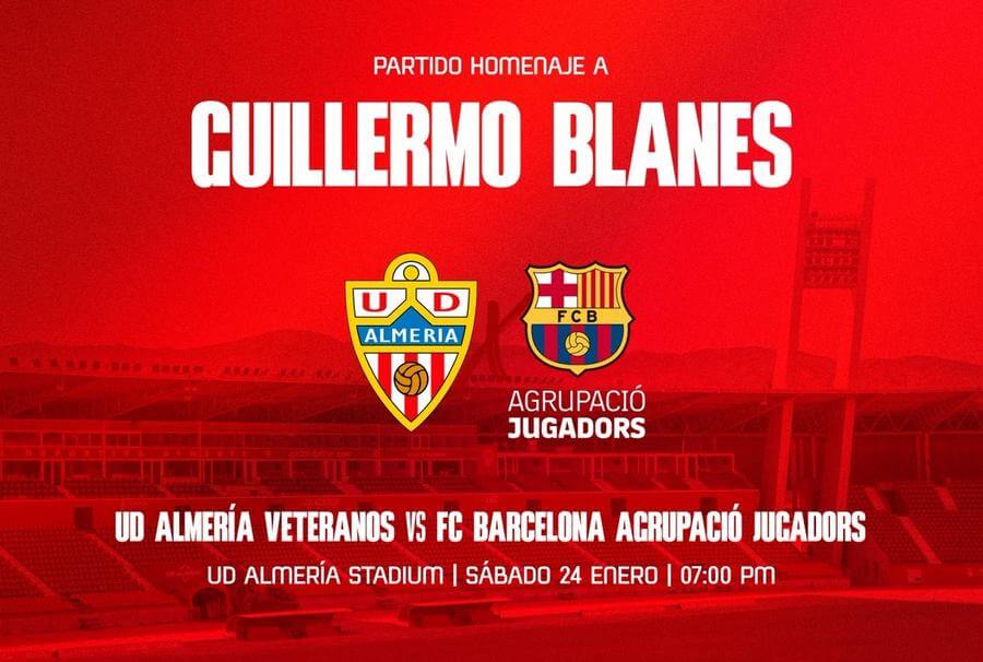 24Ene19:00 pm21:00 pmPartido homenaje a Guillermo BlanesUD Almería Veteranos vs FC Barcelona Agrupació Jugadors