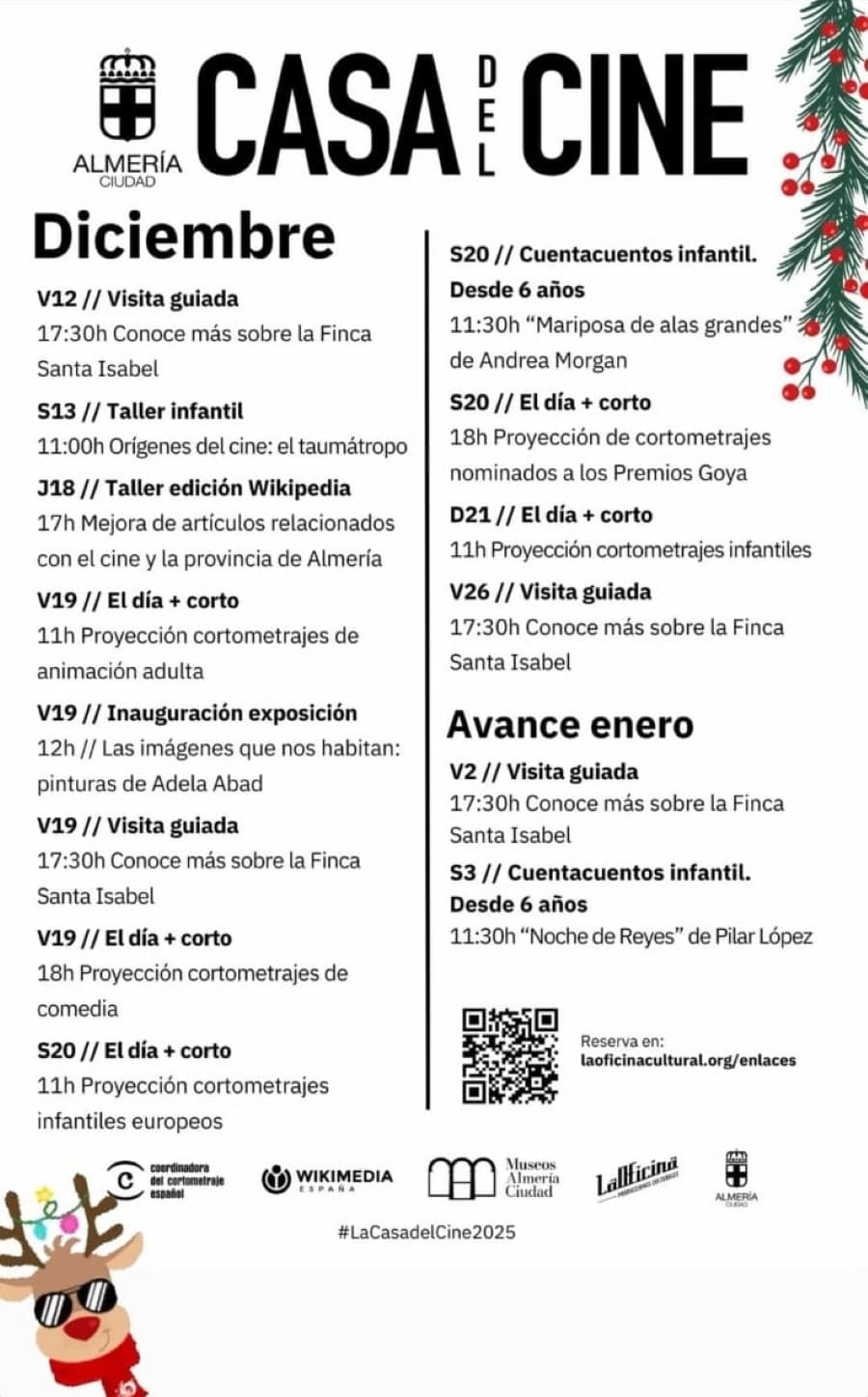 Los siguientes eventos se realizarán en la Casa del Cine. Dirección: Camino Romero, 1, 04009 Almería. DICIEMBRE 2025: Viernes 12: Visita guiada – 17:30h. Conoce más sobre la Finca Santa Isabel. Sábado