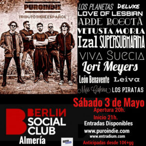 ENTRADAS: https://entradas.crashmusic.es/event/concierto-puroindie-tributo-al-indie-espanol-almeria-berlin-social-club-sabado-3-de-mayo?