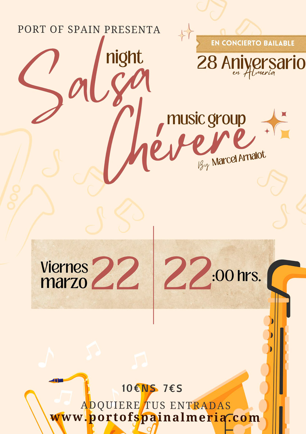 ¡Llega la Primavera! Y con ella el 28 Aniversario de la llegada de la Salsa a Almeria. Únete a disfrutar del sabor que caracteriza a Chévere Music Group, By Marcel Arnalot en su gira de conciertos bailables de música latina.