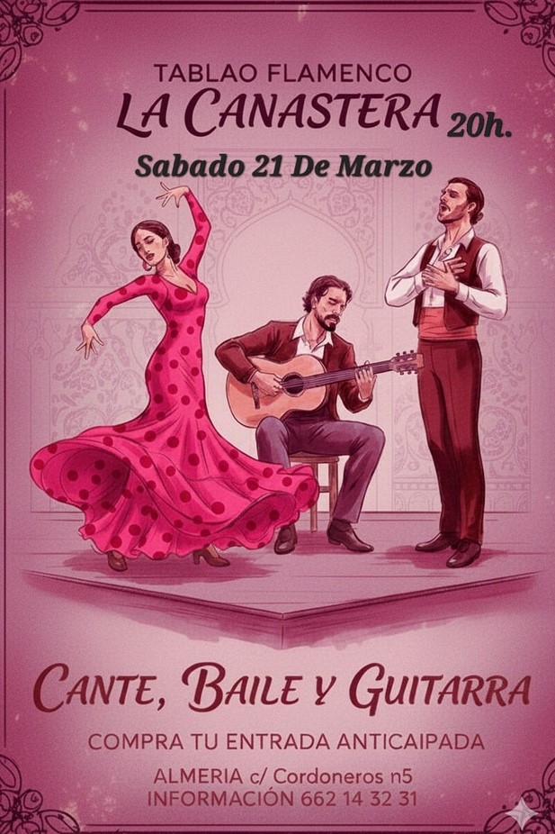 Disfruta de una noche inolvidable de flamenco en el Tablao La Canastera el sábado 21 de marzo a las 20:00. Un espectáculo lleno de pasión, arte y tradición con cante, baile y guitarra en un ambiente único. Compra tu entrada anticipada y no te pierdas esta experiencia cultural en el corazón de Almería.