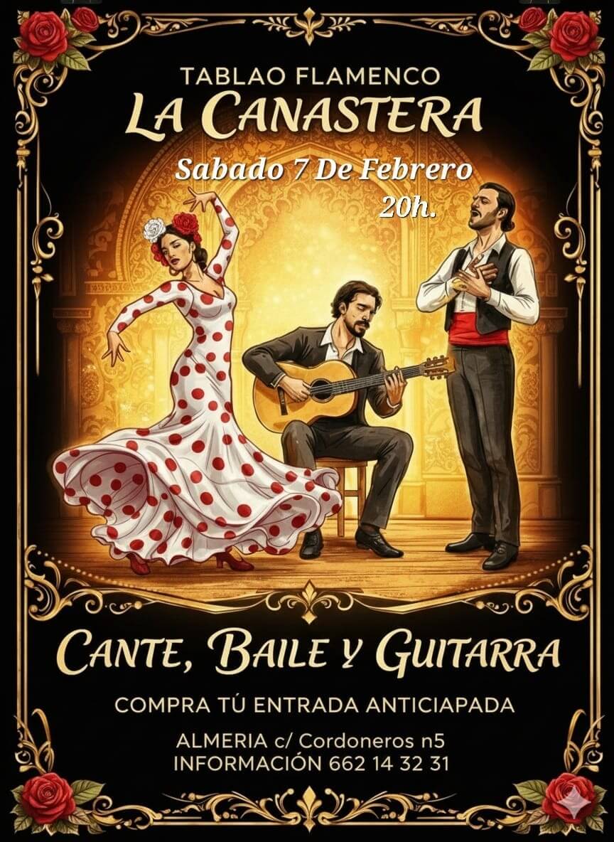 En el Tablao Flamenco La Canastera Almería, se puede disfrutar de un espectáculo en directo desde muy cerca. Igual se puede completar esta intensa experiencia con una copa de vino o cerveza para combatir el calor que provoca el nervio del flamenco, cuando en la penumbra del escenario se desarrolla el espectáculo que mueve el alma.