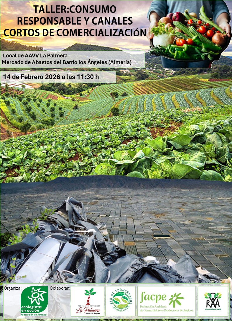 El próximo 14 de febrero de 2026 a las 11:30 h se llevará a cabo un taller sobre consumo responsable y canales cortos de comercialización en el Mercado de Abastos del Barrio Los Ángeles (Local de AAVV La Palmera), en Almería. Este evento busca poner en valor la sostenibilidad, la producción local y el papel fundamental del consumidor consciente. Organizado por Ecologistas en Acción y con la colaboración de diversas asociaciones locales, el taller plantea alternativas responsables frente a los modelos industriales de producción y distribución de alimentos.