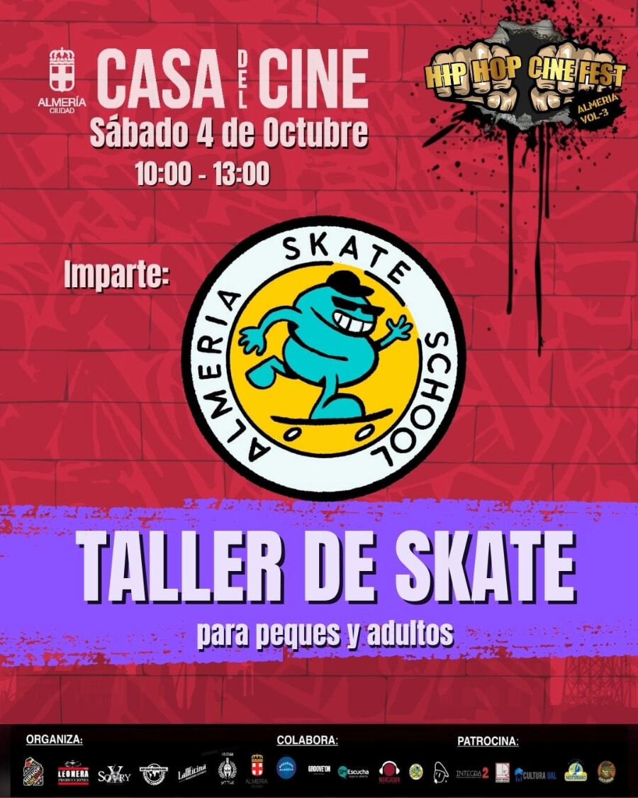 El sábado 4 de octubre en la Casa del cine de 10:00h a 13:00h: taller de Skate impartido por Almería Skate School