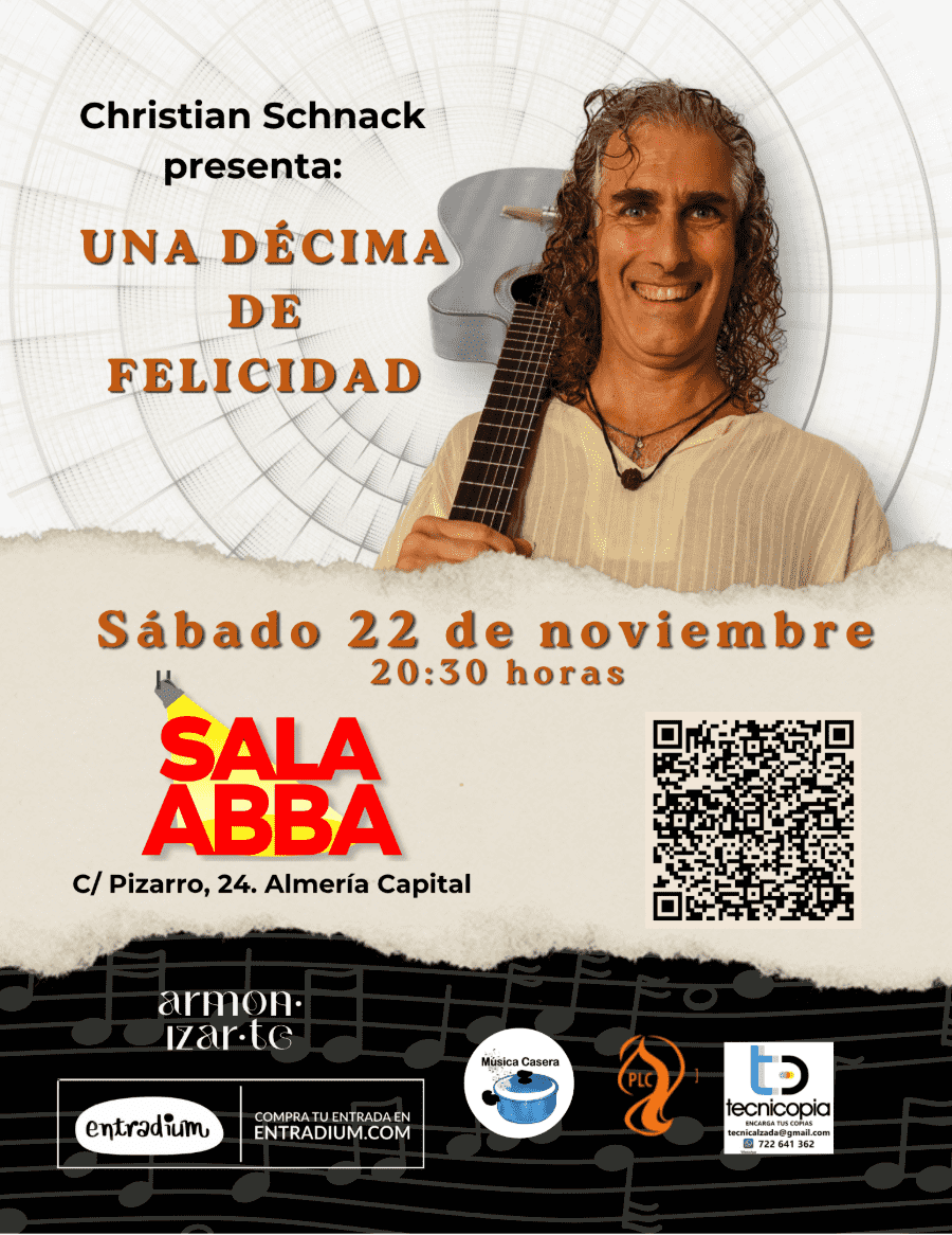 “Una décima de felicidad”, tendrá lugar el próximo 22 de noviembre a las 20:30 h en la Sala ABBA de Almería Capital, dentro del marco del Día Internacional de la Música.