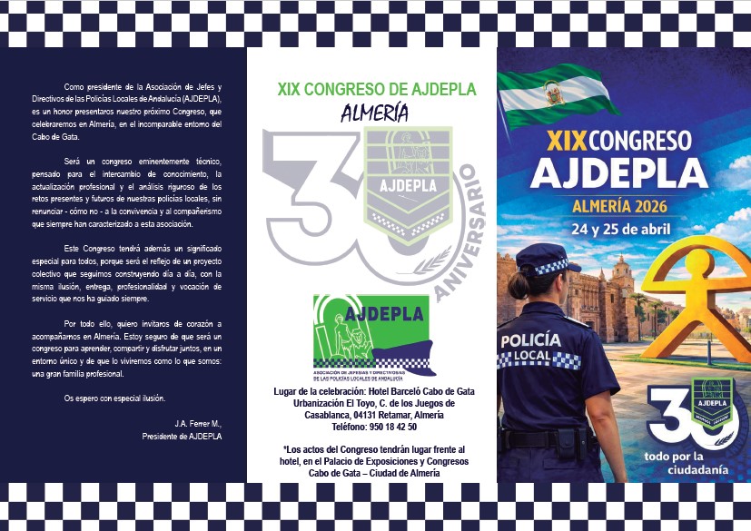 El XIX Congreso de AJDEPLA será un evento técnico dedicado al intercambio de conocimiento, actualización profesional y análisis de retos en la policía local, sin perder de vista la convivencia y compañerismo. El congreso se celebrará en Almería, en el entorno incomparable del Cabo de Gata.