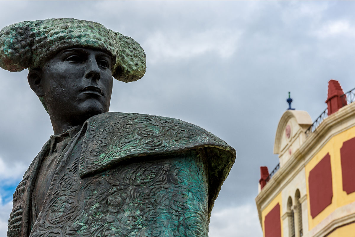 La arquitectura de la plaza es ecléctica. Consta de una planta poligonal de veinte lados, tres de los cuales se adelantan en cuerpos salientes, formando portadas monumentales de acceso a la entrada de sol, la principal, y la entrada de sombra. En la entrada principal, hay sobre la clave del arco un escudo que muestra la cabeza de un toro junto a instrumentos característicos de la fiesta. En la construcción se observa la influencia árabe en los arcos de herradura del segundo piso