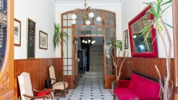 En la zona contigua a la fachada principal están situadas las dependencias del Círculo Mercantil. El vestíbulo de entrada ofrece una notable decoración debida a T. Villalba y realizada en 1920. Un alto zócalo de azulejos bordea las paredes, las puertas presentan ricas tallas y enmarcamientos con pilastras y entablamentos y los techos son artesonados dorados.