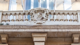 La fachada está dotada de tres cuerpos horizontales con niveles de pisos a distintas alturas diferenciados por cornisas, siendo de mayor metraje el primero y disminuyendo los dos siguientes a medida que se elevan. Los huecos de luz se delimitan con pilastras y falsas columnas. La decoración se compone en su primera planta de cinco puertas dinteladas en arco, elaboradas en madera y cristal. La parte superior de estas se adorna con enrejados de hierro forjado, con un escudo también de hierro, en el centro de cada una de ellas.