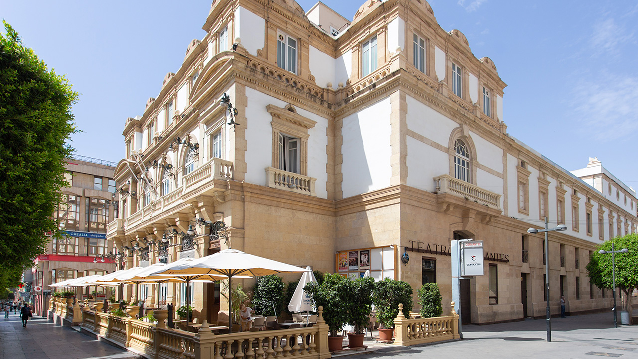 El balcón central está terminado con arcos de medio punto adornados en su clave con tondos enmarcados. Se apoyan sobre medias columnas adosadas de capitel cuadrado rematadas con volutas, en cuyo centro se adornan con alegorías a las artes escénicas (musas y liras). En el centro de la balaustrada un tondo con la imagen laureada de Miguel de Cervantes justifica el nombre del teatro. La iluminación exterior se resolvió con lámparas de hierro fundido y cristal con forma de girasoles que le confieren un aire modernista. Alberga la sede de la Sociedad del Círculo Mercantil de Almería.
