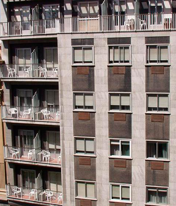 El proyecto original de este hotel mostraba la indefinición estética del momento, sobre todo en este tipo de edificaciones hasta entonces poco habituales, presentando muy marcado el modelo de fachada pabellón con refuerzo de sillares en esquina de piedra artificial e incluso la presencia de su zócalo base. Todo ello combinado con elementos ajenos a la tradición historicista, como la ventana continua ocupando todas las plantas, los balcones con terraza y una entrada carente de cualquier artificio clasicista.