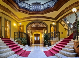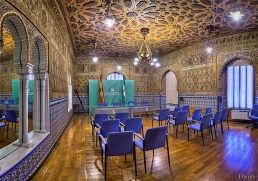 En el interior, el edificio adquiere un sabor historicista, retomando estilos artísticos relacionados con etapas brillantes de la historia de España: es el caso de las bóvedas de arista de la planta baja de claro sabor prerrománica y conventual, la monumental escalera renacentista y muy especialmente el barroco andaluz del siglo XVII utilizado para el patio central abierto.