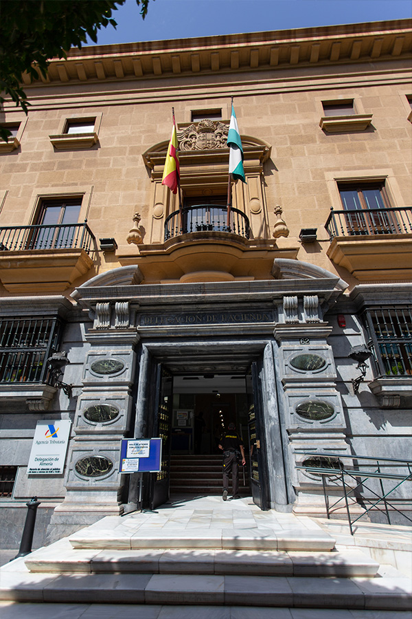 Los arquitectos Cámara Niño y Faci ganaron el concurso convocado por el ministerio de Hacienda en 1940 para la realización de uno de los edificios representativos del Régimen Franquista en Almería. Compuesto con un historicismo manierista muy enfático en sus materiales y molduras y proporciones abigarradas, especialmente en lo que percibe el paseante, y también en la escalera y espacios de atención al público.
