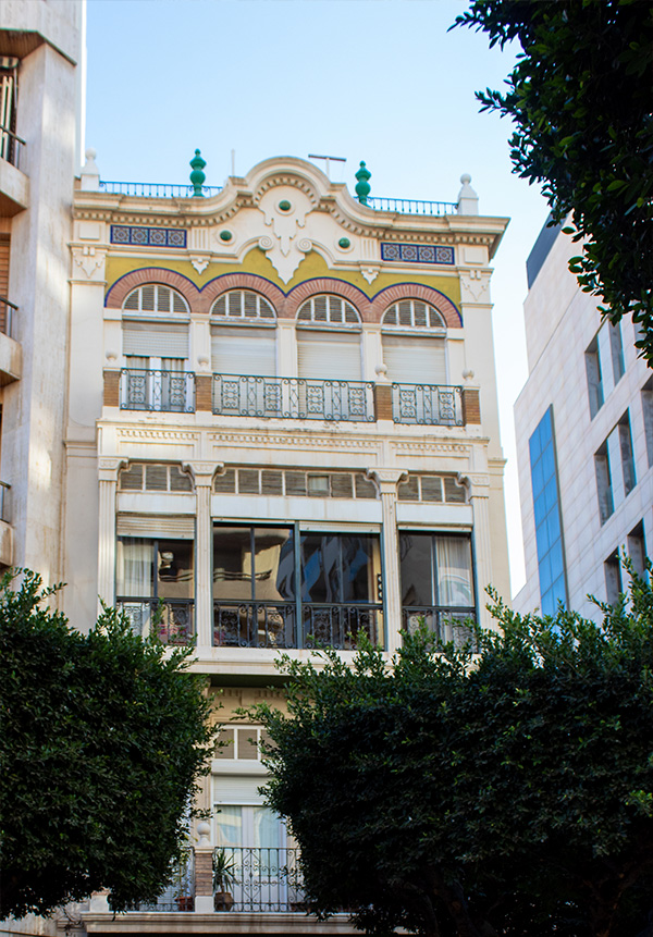El segundo piso se organiza de igual modo que el anterior, y tan solo se diferencia de éste por presentar un balcón de planta semicircular por cada uno de los vanos. El último piso, por su parte, repite este esquema, introduciendo la variante de un remarque de medio punto en todos sus huecos. La fachada lateral se ubica en el Paseo de Almería, y su división es similar a la de la principal.