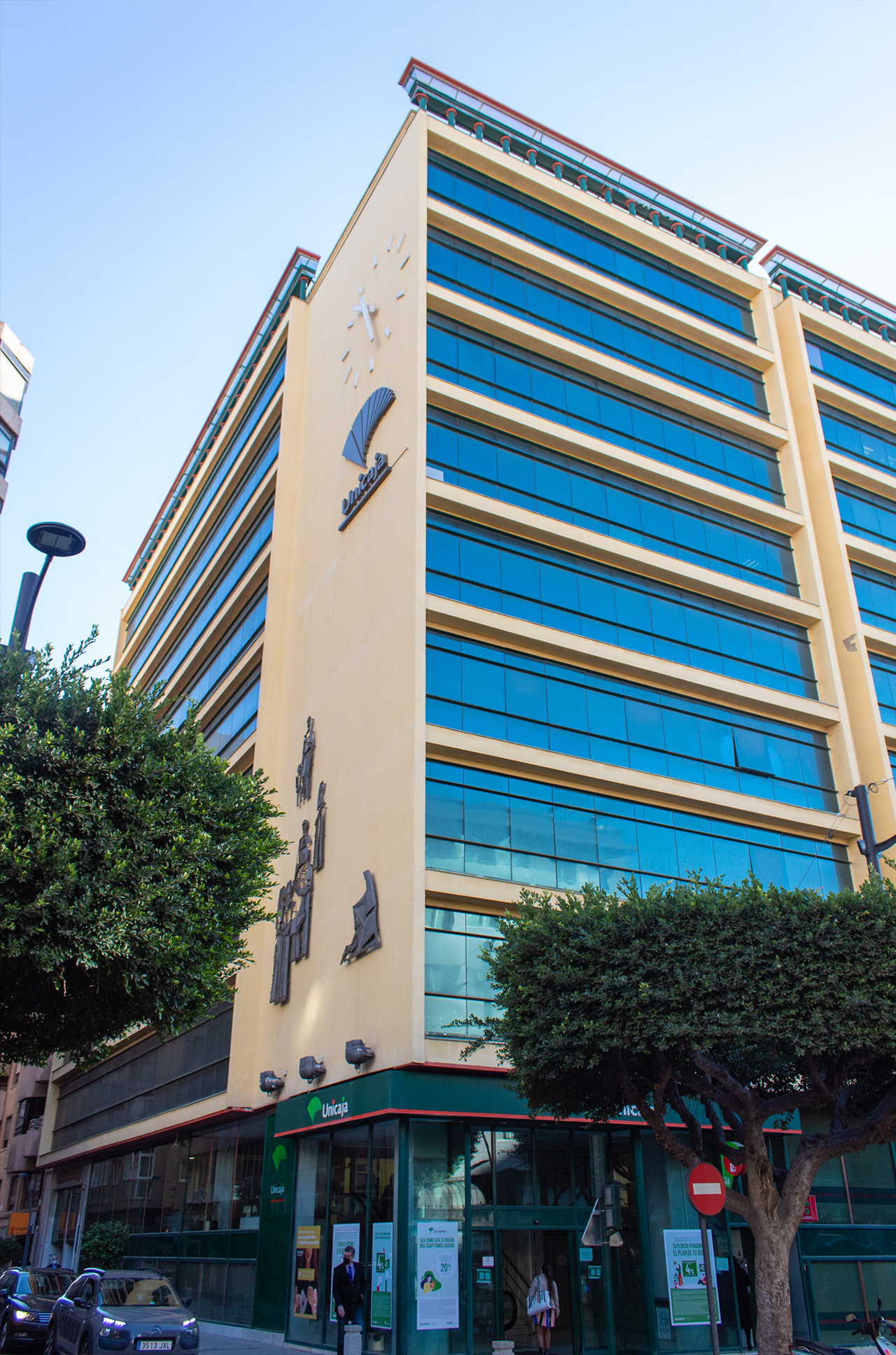 Otro de los edificios que rompe totalmente con la tradición arquitectónica de el Paseo es el edificio de la sede central de Unicaja. El proyecto fue adjudicado mediante concurso nacional convocado en 1966 por la entones Caja de Ahorros y Monte de Piedad de Almería para sus nuevas instalaciones. Basado en una rigurosa composición de fachada y el uso del vidrio y la piedra, el edificio presenta una imagen prototecnológica adecuada al uso de oficinas al que se destina.