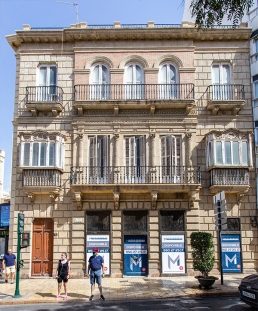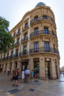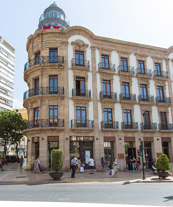 Compartiendo la medianera con el edificio de Enrique López Rull, ya pegado a calle Regocijos, se encuentra este edificio realizado por Guillermo Langle Rubio.
