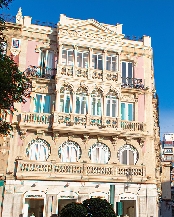 El Edificio de las Mariposas es quizás el más emblemático de la ciudad, por su situación en plena Puerta Purchena, por su belleza y dimensiones.
