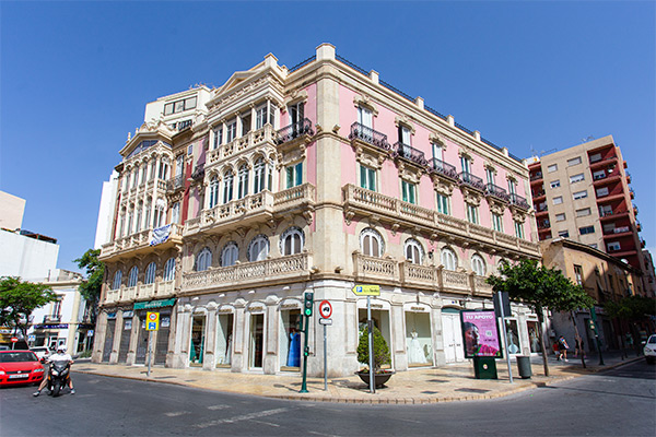 Aquí destaca especialmente la textura de materiales (con el uso de cerámica vidriada en ajedrezado en las esquinas superiores y el frontón del mirador, el paramento de ladrillo, o el uso de la piedra de cantería delimitando los elementos estructurales y el encuadramiento de los huecos), la pesadez del monumental zócalo de piedra, que abarca incluso hasta el entresuelo, y el coronamiento con pináculos sobre la balustrada en relación con los ejes verticales de composición. Representa el cenit del lenguaje neobarroco en Almería, aprovechando para ello su privilegiada situación en la trama urbana.