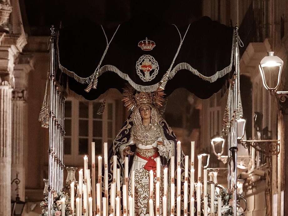 Puntos de interés: Salida del templo, encuentro con el Santísimo Cristo del Amor (salida C/Santísimo Cristo del Amor) con Nuestra Señora del Primer Dolor (salida del templo), pétala en Colegio la Milagrosa, plaza de la Virgen del Mar, plaza de la Catedral, C/Las Tiendas, entrada al templo. Punto de cante: desde el balcón de la esquina de C/ Jovellanos con C/ las Tiendas.