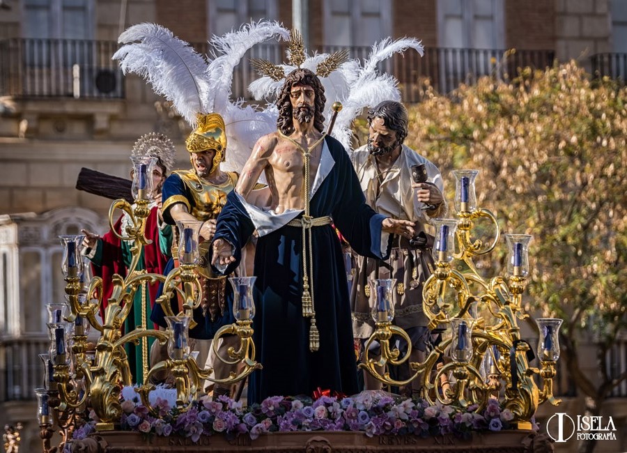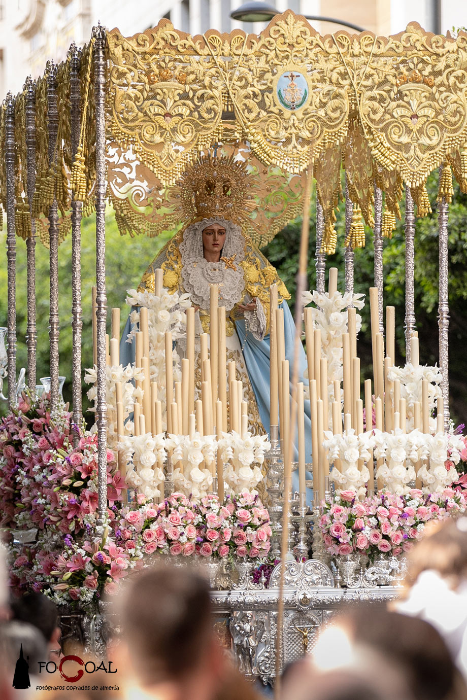 Itinerario: I.P. Santa María de los Ángeles (salida de nazarenos y mantillas), Plaza de la Plata, C/ Quinta Avenida, C/ Maestría, C/ España, C/ Diamante (Casa de Hermandad, recogida de imágenes), C/ Turquesa, C/ Maestría, C/ Quinta Avenida, C/Inglés, C/Granada, Puerta de Purchena, Plaza Manuel Pérez García, C/ Tiendas, C/ Virgen de la Soledad, Plaza Flores, C/ Plácido Langle, Plaza San Pedro, C/ Ricardos, Paseo de Almería, C/ General Tamayo, C/ Lucano, C/ Trajano, C/ Eduardo Pérez, Plaza de la Catedral, C/ Cervantes, Plaza de la Administración Vieja, C/ Tiendas, Plaza Manuel Pérez García, Puerta de Purchena, Avenida Pablo Iglesias, Plaza Virgen del Consuelo, C/ Cruces, C/ Quintana, Avenida Vilches, C/ Acosta, C/ Malecón de San Blas, C/Lopán, Avenida de Los Ángeles, C/ Turquesa, C/Diamante, Casa de Hermandad.