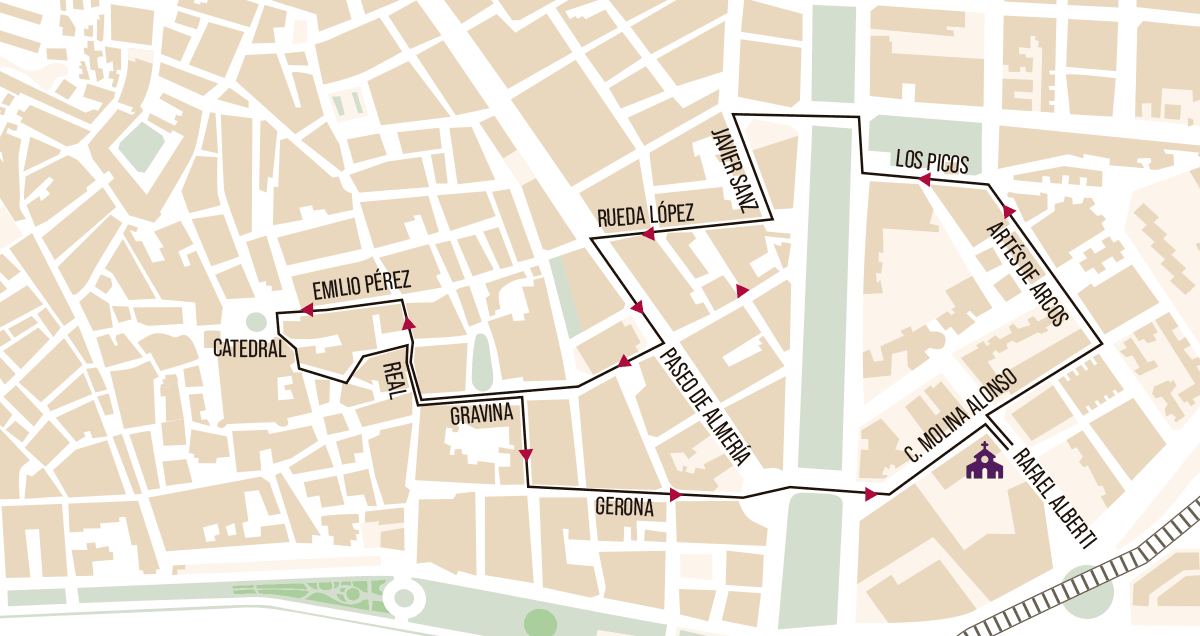 Itinerario: I.P. Santa Teresa de Jesús, Rafael Alberti, Canónigo Molina Alonso, Hermanos Machado, Artés de Arcos, los Picos, Avda. Federico García Lorca, Rambla, Eguilior, Javier Sanz, Rueda López, Reyes Católicos, General Tamayo, Paseo de Almería, General Tamayo, Plaza Virgen del Mar, Lucano, Trajano, Eduardo Pérez, Plaza de la Catedral, Cubo, Plaza Masnou, Real, Gravina, Plaza Virgen del Mar, General Tamayo, Paseo de Almería, Marqués de Comillas, Avda. Federico García Lorca, Plaza Emilio Pérez, Canónigo Molina Alonso, Rafael Alberti, I.P. Santa Teresa de Jesús.