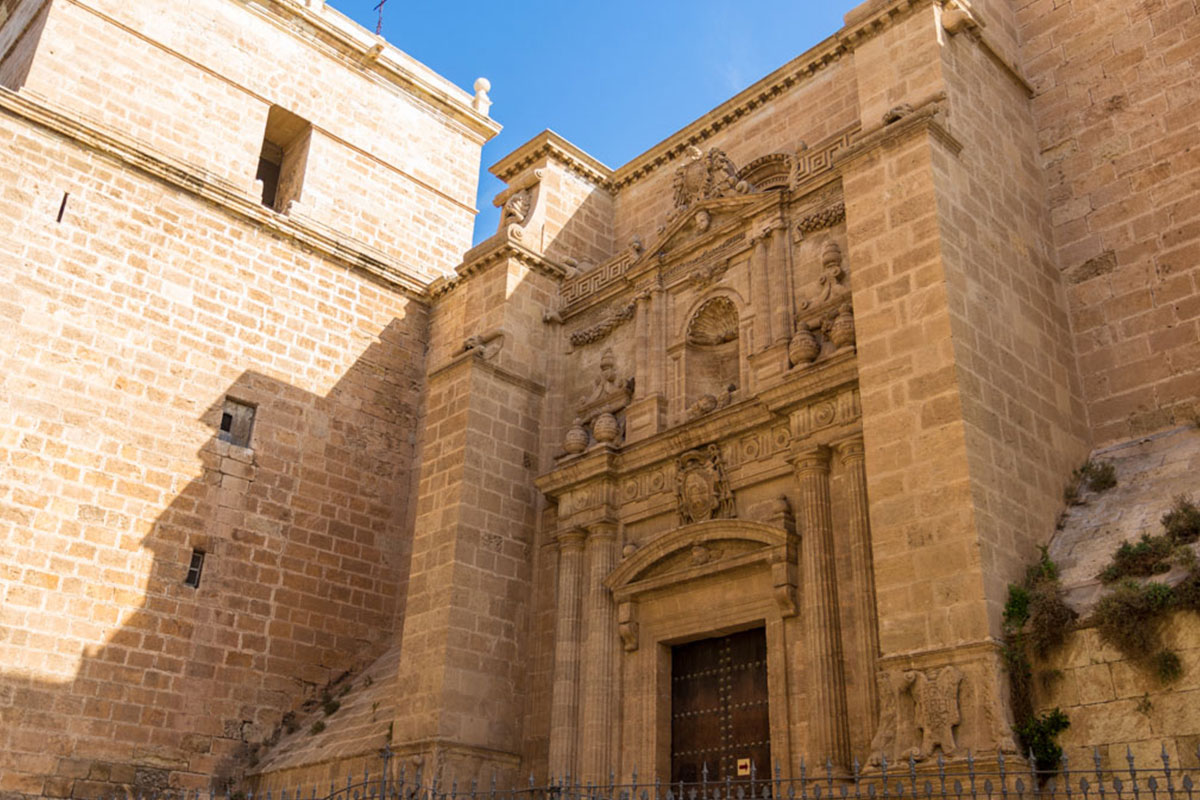 La catedral se empieza a construir en el año 1524, tras el terremoto que en 1522 destruyera la primera, que estaba situada en la Medina, sobre la Antigua Mezquita Mayor. Su característica principal es la de ser catedral-fortaleza, porque se construye tanto para el culto religioso como para refugiarse la población de los ataques de piratas berberiscos. Característica ésta que se puede observar en su fachada principal: empleo de grandes contrafuertes y torreones en sus esquinas, muros macizos y la decoración concentrada en su portada principal, donde campean el escudo de Carlos I de España y V de Alemania, y el del Obispo Fundador de la catedral, Fray Diego Fernández de Villalán. La portada lateral de la calle Velázquez, y denominada de “Los Perdones”, es del mismo estilo renacentista que la principal, aunque de decoración más sencilla.